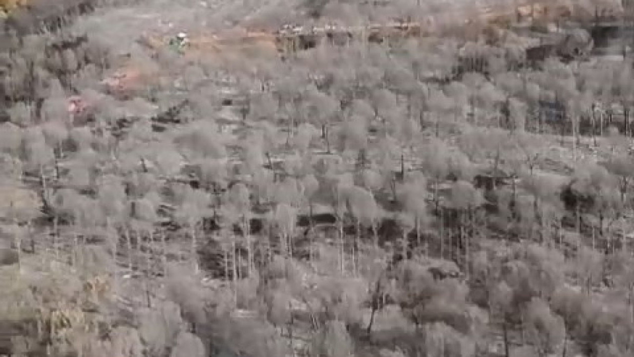 Yaklaşık 16 saatin sonunda söndürülen alevlerden geriye kalan, küle dönmüş alan soğutma çalışmalarına katılan helikopterden böyle görüntülendi.