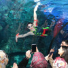Tüpsüz şekilde balıklarla dolu akvaryuma giren sporcu, 10 dakika boyunca etkileyici bir performans sergiledi. Halkanın içinden geçme, sıçrama, ters dönme gibi su balesi tekniklerini sergileyen Deniz Kızı’nın performansına alkışlarla eşlik eden ziyaretçiler, büyüleyici gösteriyi telefonlarla görüntüleyerek kayıt altına aldı. Kendisini alkışlayan ziyaretçileri selamlayan sporcu, akvaryumun camına yaklaşarak çocuklarla fotoğraf çekildi.